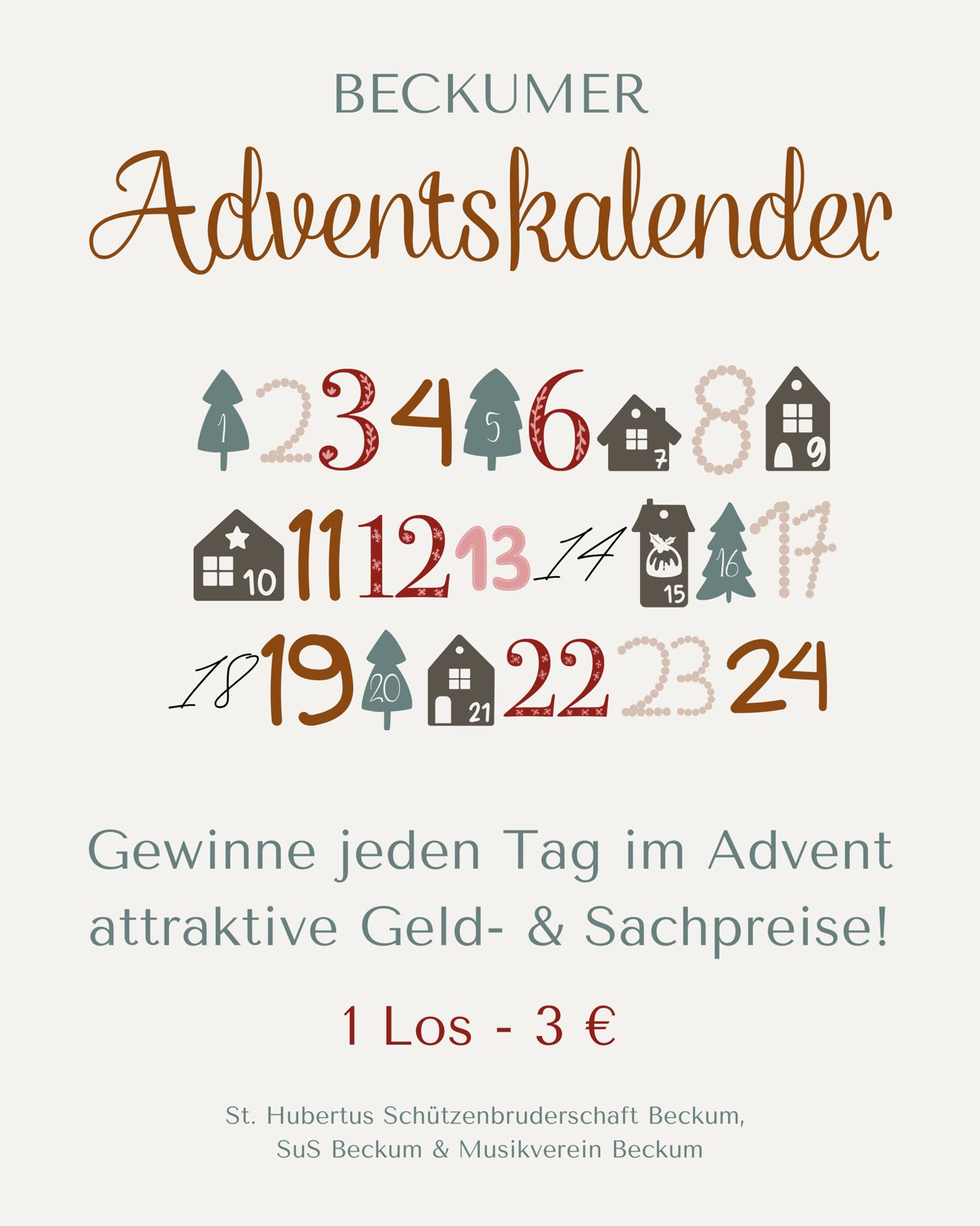 Wir Beckumer lassen im Advent wieder die Fenster erstrahlen. Vom 01. bis 24. Dezember könnt Ihr wieder täglich ein anderes Adventsfenster aufspüren und bestaunen. Wir freuen uns auf möglichst viele