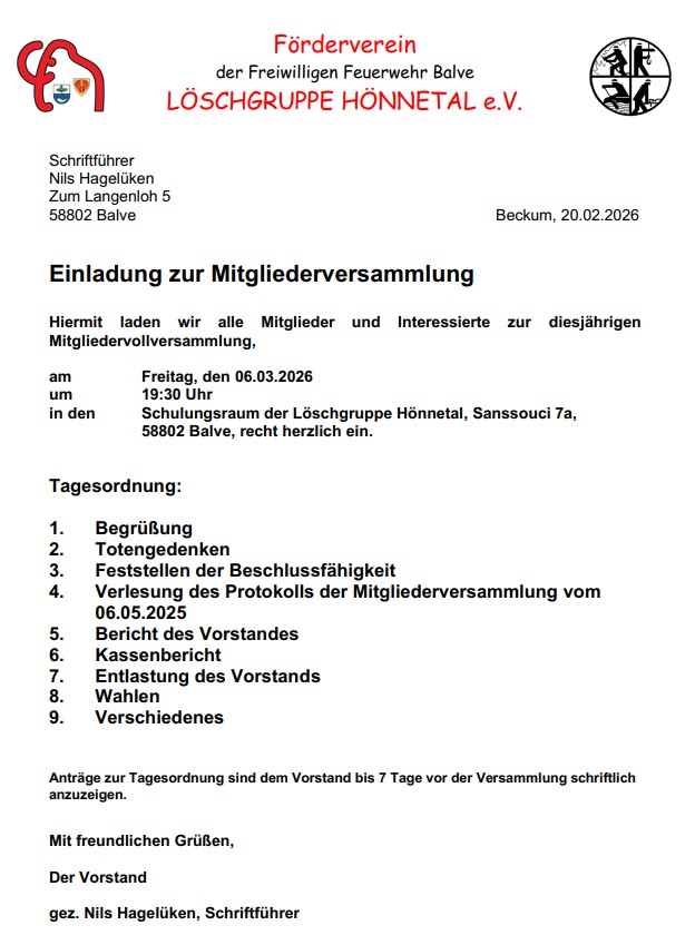 Jahreshauptversammlung des Fördervereins der Löschgruppe Hönnetal