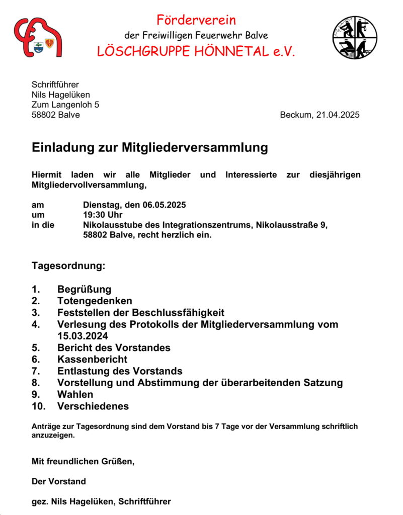 am Dienstag, den 06.05.2025 um 19:30 Uhr in die Nikolausstube des Integrationszentrums, Nikolausstraße 9, 58802 Balve, recht herzlich ein.