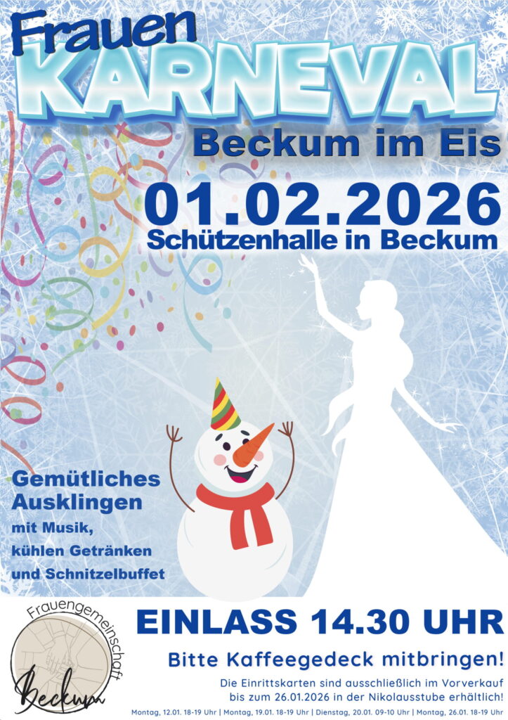 Am Sonntag, 01.02.2026 findet der diesjährige Frauenkarneval der Frauengemeinschaft Beckum statt.
