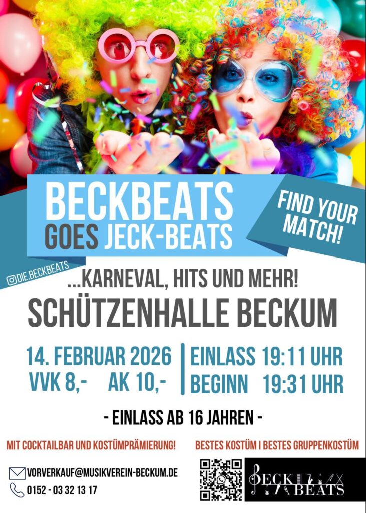 Es ist wieder so weit: Wenn sich die Hönnetalhalle in ein Ort voller bunter Farben, Musik und guter Laune verwandelt, kann das nur eines bedeuten: „BeckBeats goes JeckBeats“ geht in die dritte Runde! Am Samstag, den 14. Februar 2026, lädt der Musikverein Beckum alle Feierwütigen zur großen Karnevalsparty ein.